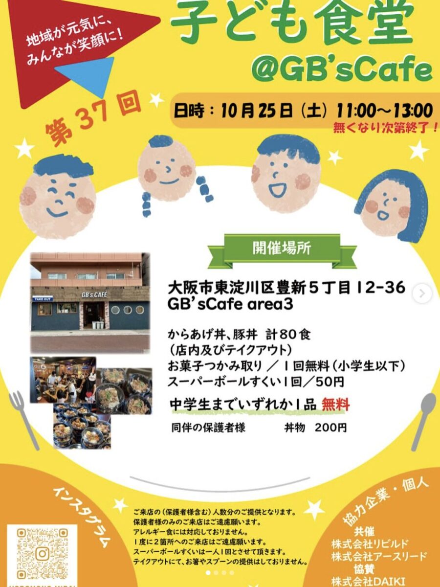 【東淀川区豊新】上新庄の「GB’s CAFE area3」で今月も子ども食堂開催!(10月25日)