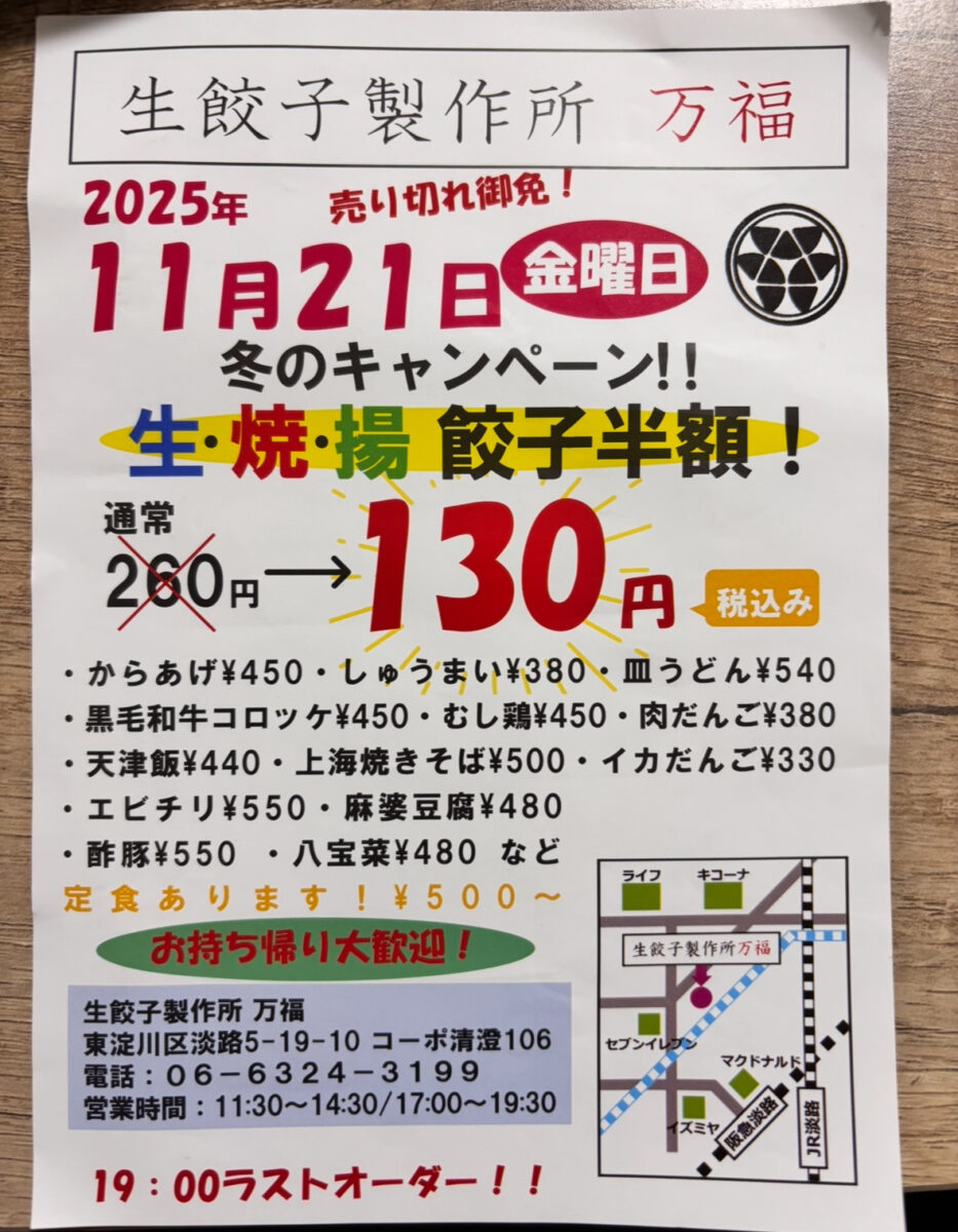 【東淀川区淡路】生・焼・揚餃子が半額!「生餃子製作所 万福」で冬のキャンペーンが11月21日(金)限定開催