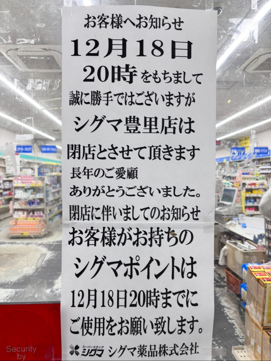 店頭の貼り紙には「12月18日20時をもちましてシグマ豊里店は閉店させて頂きます」とのメッセージが掲示されていました。長年利用していた方にとっては寂しいお知らせです。