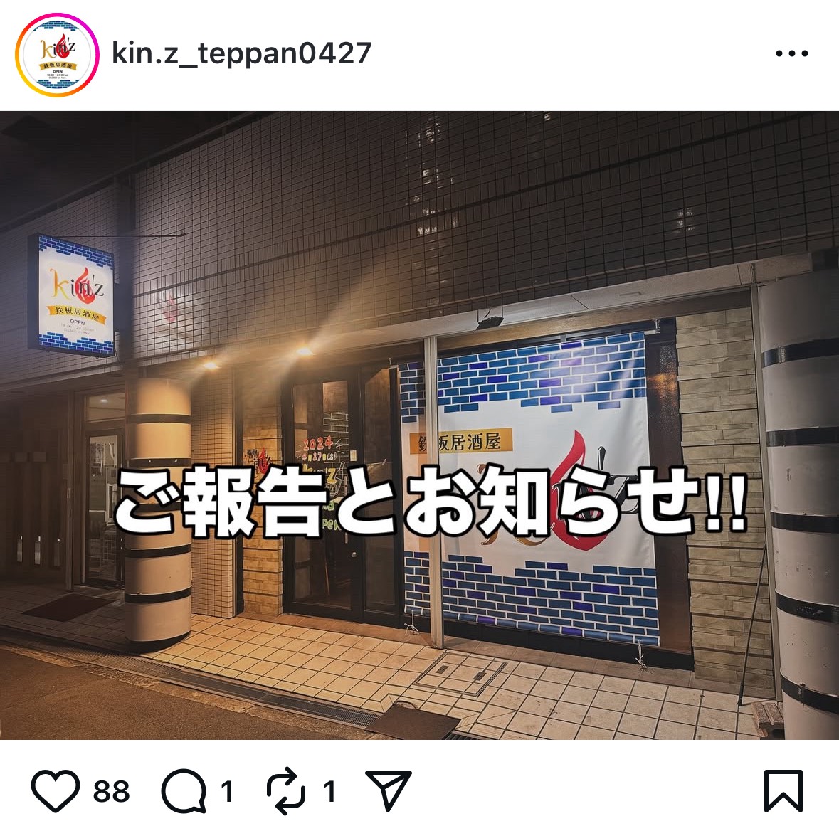 鉄板居酒屋 kin’z の閉店について